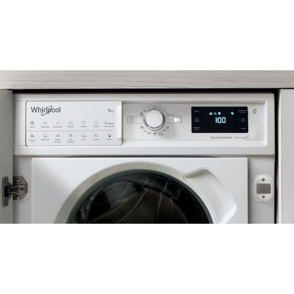 This Whirlpool built in Washing Machine features: white A spacious, large 9,0kg capacity. B energy rating. A fast, resource-efficient 1400 revolutions per minute spin speed. Exclusive 6th SENSE technology, uses sensors within the drum to assess how dirty your laundry is, the cycle is automatically adapted, saving up to 50% on energy, water and time, as well as reducing detergent wastage.